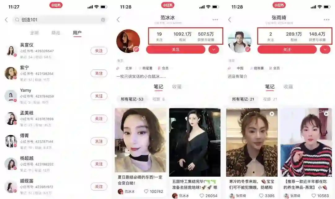 自从去年11月底,小红书开始邀请各路明星入驻,如今大小明星超过200个。小红书很会蹭流量蹭热度,前段时间乘着火爆全网的《偶像练习生》和《创造101》冠名迅速涨粉,狠狠地刷了一把存在感,吸引越来越多的明星在小红书安营扎寨。此外,也引入了自带流量体质的明星级KOL,如最近又登上热搜榜的张雨绮、范冰冰等。
