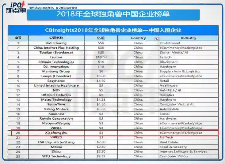 2018年8月,全球知名风投调研机构CB Insights公布2018年全球独角兽企业榜单,以10亿美元市值为考核基准,其中,小红书排名第20位。