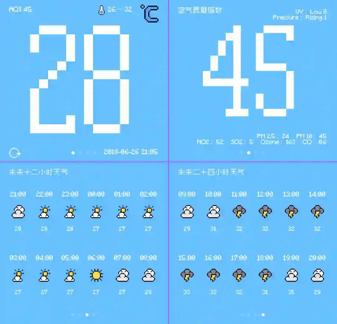 在像素应用中,屏幕被不同的颜色分成了多个区域。顶部显示的是当前的天气情况,包括相对湿度、风速、降水概率及降水量。在中心区域左右滑动即可切换查看温度、其他详细数据及未来 24 小时的天气情况。你可以在第二屏看到空气质量指数。除了 AQI 之外,你还可以查看到空气中细如 PM 含量及各种物质的含量。不仅如此,在第二屏的右上角,你还可以看到当前的紫外线和大气压的状态。而底部显示的则是最近一周的天气预报。