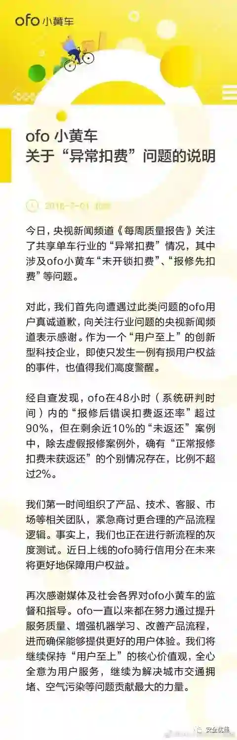 7月1日下午,ofo就近日ofo小黄车“为开锁扣费”、“报修先扣费”等异常扣费问题作出回应,称经自查发现,ofo在48小时(系统研判时间)内的“报修后错误扣费返还率”超过90%,但在剩余近10%的“未返还”案例中,除去虚假报修案例外,确有“正常报修扣费未获返还”的个别情况存在,比例不超过2%,同时也在进行新流程的灰度测试。