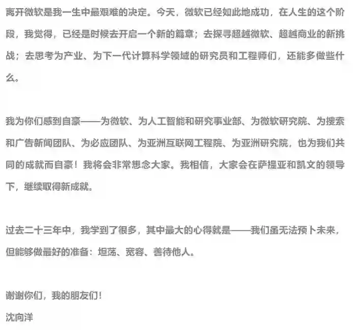沈向洋在道别信中也表示,离开微软是自己一生中最艰难的决定;如今,微软已经非常成功,而自己也是时候去开启一个新的篇章;去探寻超越微软、超越商业的新挑战;去思考为产业、为下一代计算科学领域的研究员和工程师们,还能多做些什么。