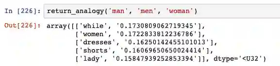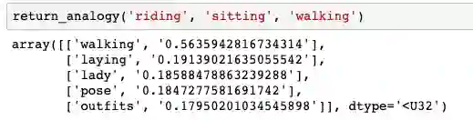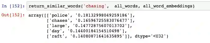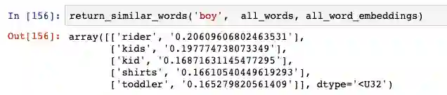我们可以使用 100 维表示 (100-dimensional representation) 来构建一个函数,该函数提出与输入单词最相似的单词。它的工作原理很简单:采用 100 维的表示,并找出它与数据库中所有其他单词的余弦相似度。
