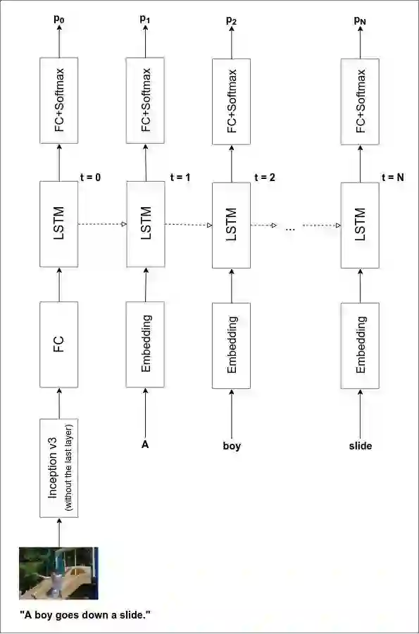 回想一下我们如何从图像表示中解码图说。我们将该表示提供给 LSTM/GRU 网络,生成一个输出,将其解释为第一个单词,然后将第一个单词返回到网络以生成第二个单词。这个过程一直持续到网络生成一个表示句子结束的特殊标记为止。