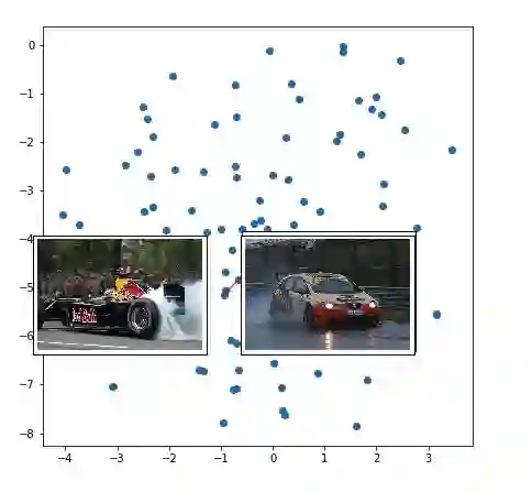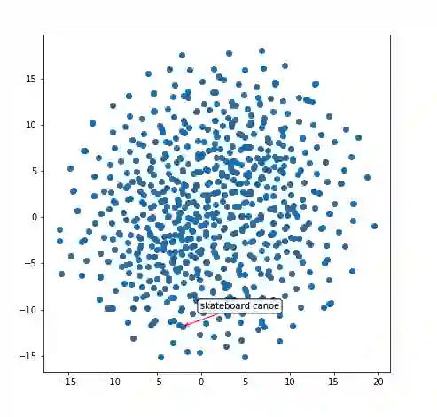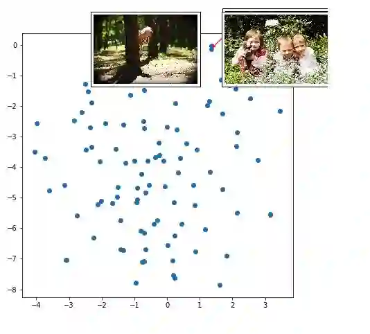 如果单词表示将类似的单词聚在一起,那么图像表示 (Inception 支持的图像编码器输出) 呢?我将相同的 t-SNE 技术应用于图像表示 (在 caption decoder 的第一步中作为输入的 300-dimensional tensor)。