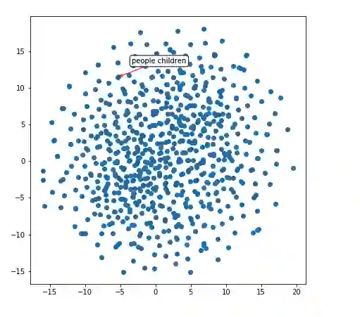 让我们来看看 caption decoder 学习到的词汇嵌入空间 (不像其他语言任务有数百万单词和句子,我们的解码器在训练数据集中只有 ~30k 的句子)。