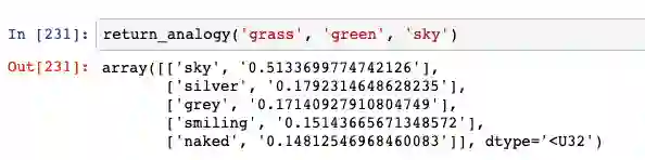网络认为 sky 对应 silver 或 grey 的,虽然没有出现 blue,但它给的结果都是颜色词。令人惊讶的是,这个网络能够推断颜色的方向。