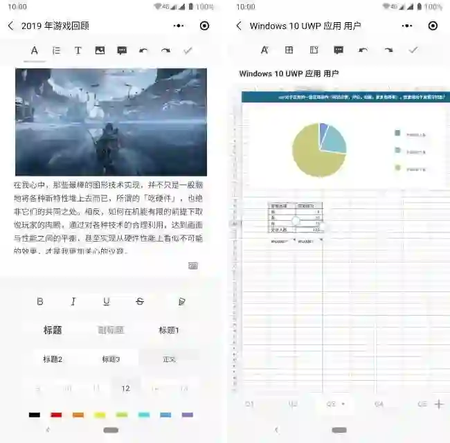 当然,在具体的支持程度上,三者之间还是有所区别的。这其中金山的表现比较不错,除了能保证文档的内容大致不走样,你甚至还能实现一些基本的编辑功能,例如插入图片、编辑行距、使用函数,等等。尽管体验上依旧和大屏 + 键鼠没法比,但在手机上,这些功能更多是以备不时之需。