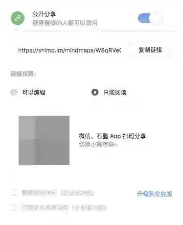 三家文档都支持通过链接或者二维码/小程序码分享某个文件。石墨文档的分享设置非常简单直接,只有一个「公开分享」开关,打开后可以选择是否允许获得链接的人编辑文档。虽然它还提供了密码保护功能,但只有企业版才能使用。