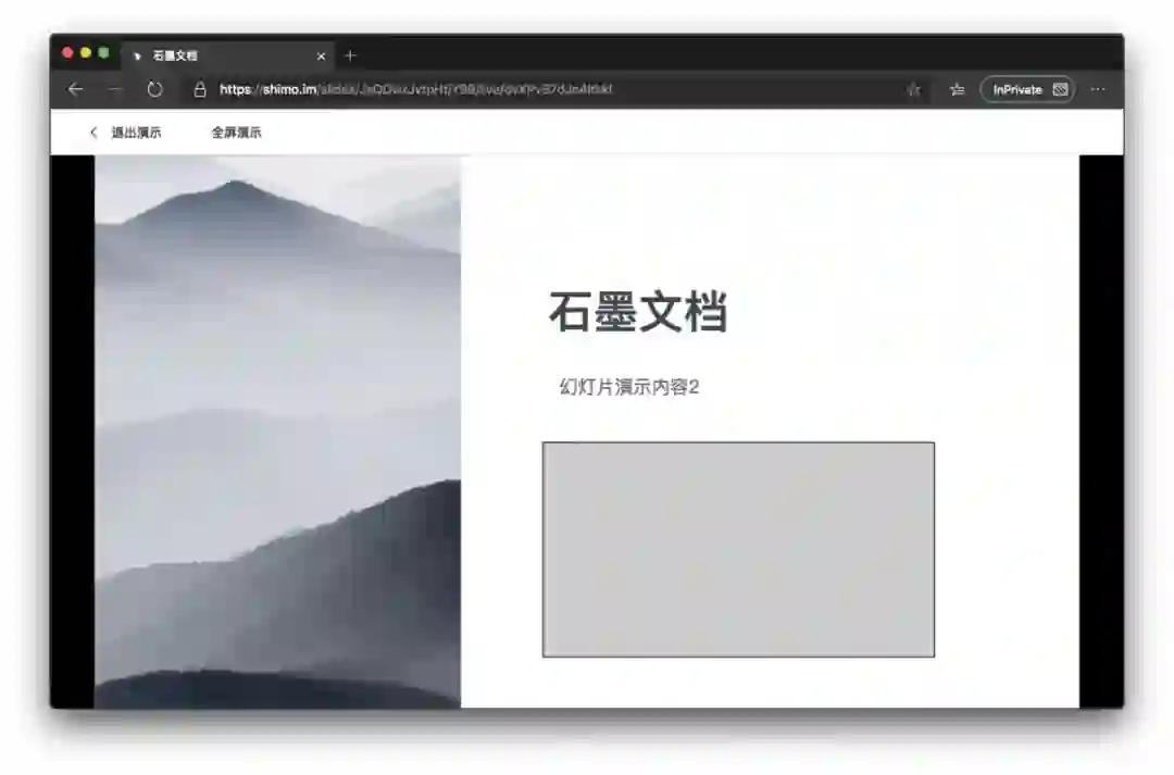 石墨的远程演示功能没什么可说的,它会新建一个放映链接,将这个链接发送给其他人,就能邀请他们观看你的幻灯片。你没法看到访客的具体信息,除了手动退出演示,访客能做的操作也并不多。
