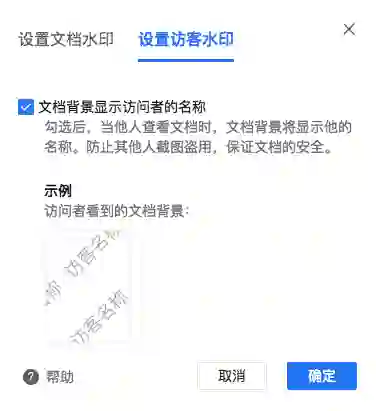 腾讯文档还支持一些额外的功能,例如它可以直接打开「访客水印」,打开后获得链接的人需要登录才可以查看文档;在查看时,文档背景会出现印有用户名的水印。要防范文档被随意截图传播,这招还是很有用的。