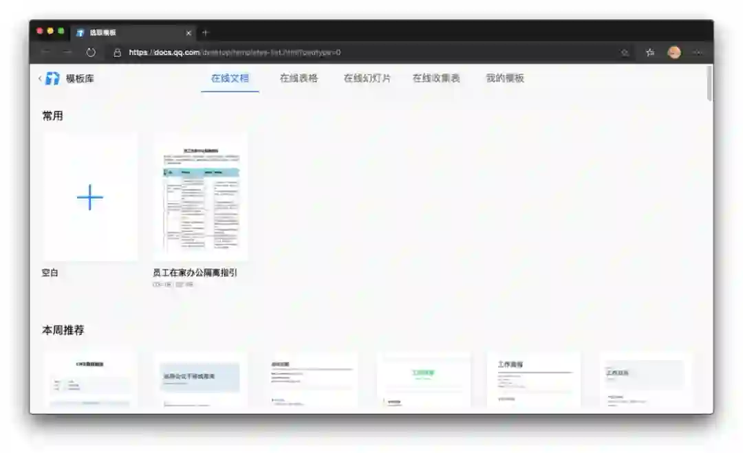 金山和腾讯都可以直接在下拉菜单中选择文档类型,然后再选择用模版创建或是新建空白文档,交互逻辑上相比石墨更符合直觉,而且也都设计了一些抗疫期间可能用得上的主题模版。