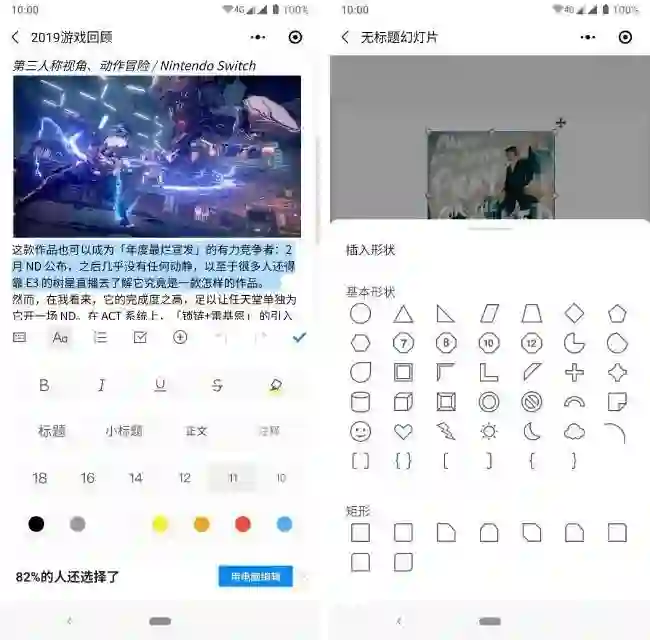 而腾讯文档的小程序,在功能上大约介于金山和石墨之间,对于文字和表格而言还是稍逊于金山,但幻灯片可以添加形状这一点,着实是惊到了我。