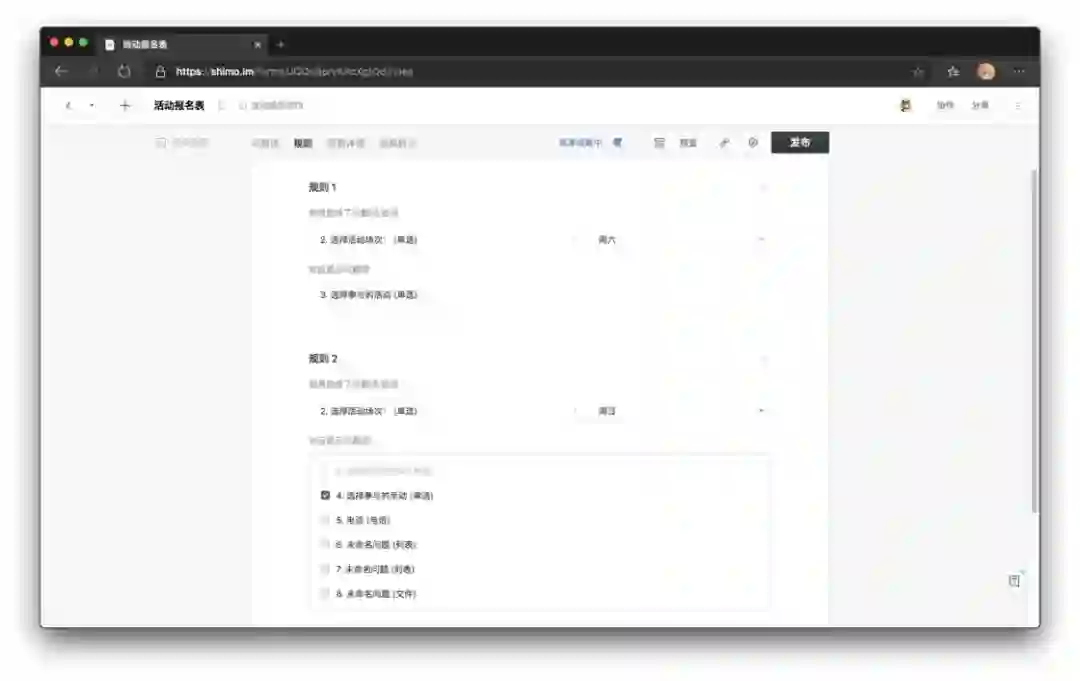 石墨和金山都支持对逻辑规则的设置,可以根据用户的选择显示相应的题目。然而石墨的规则设置有些奇怪,具体体现在一个题目只能被一个选项所引用。