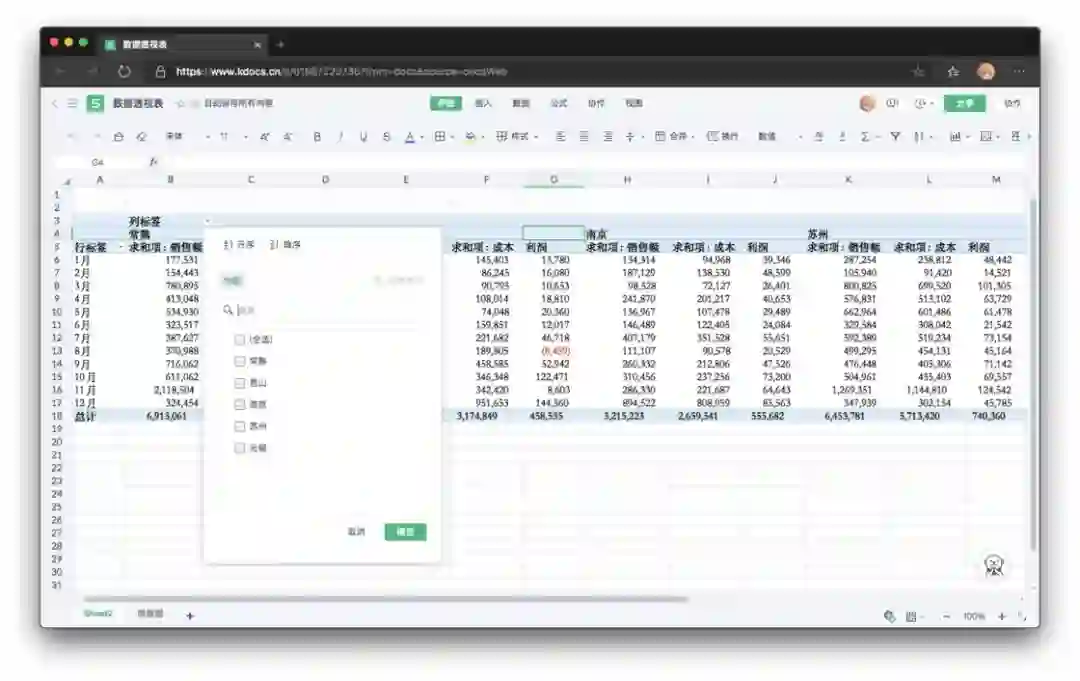 在表格这一块,金山依旧延续了其在兼容性上的优势;有趣的是,虽然金山文档似乎并未提供数据透视表的编辑器,但它可以正常显示 Excel 生成的数据透视表,内容上没有发现错误,也能对行列标签进行筛选。