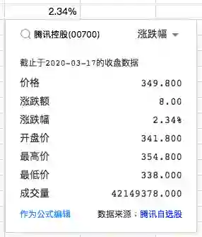 腾讯表格在基础功能上做得有板有眼,同时还提供了一些特色功能,例如 ID 和 STOCK 这两个专属函数。前者可以根据身份证号码获取年龄、性别、出生年月等信息;后者则可以获取指定股票前一交易日的报价、涨跌幅、市值等数据。