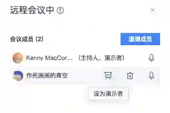 在这点上,金山文档的「远程会议」,对于观看者的管控显然要更为全面。不仅可以禁止他人翻看文档,金山还能直接将成员移出演示,并且在开始演示后可随时关闭入口;除了现有的成员之外,其他人都会被拦在外面,无法观看演示。在演示过程中,你还能直接将其他人设为演示者。
