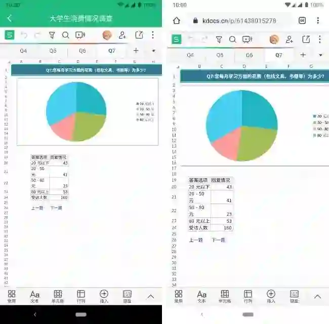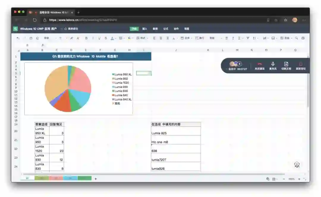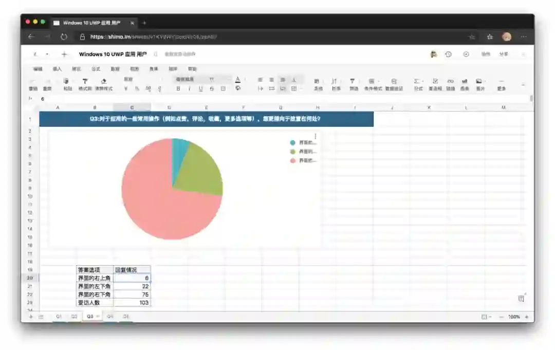 对于收集到的统计数据,三家都能与表格文件进行关联,并作为 Excel 文档进行导出。其中石墨和金山可以将统计结果在后台以图表的形式显示,石墨为表格 + 柱状图,金山则为表格 + 饼图。