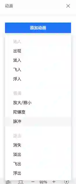 这还没完,动画功能这一块,腾讯也能拿到分。虽然它和金山一样暂不支持翻页动画,但对于单一对象的动画,腾讯提供了多达 11 种,而且同样拥有比较详细的设置项。