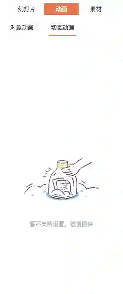 正当我满心欢喜地打算看看它支持的动画效果时,现实却迎面给我浇了一瓢冷水 —— 切页动画显示「暂不支持,敬请期待」,对象动画也只支持「飞入」和「消失」两种。