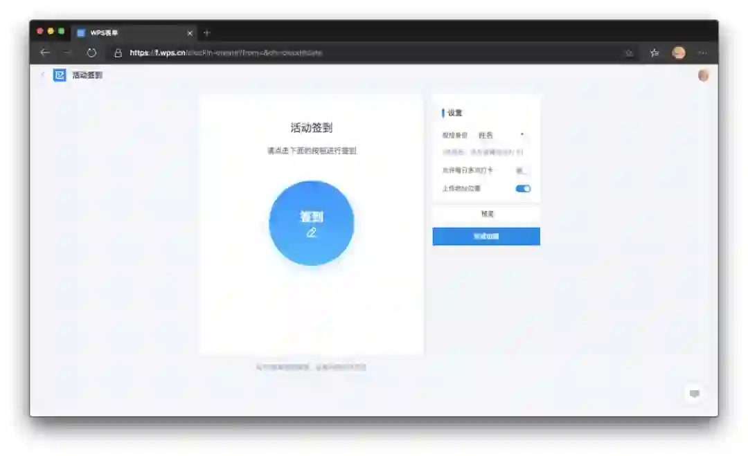 除了传统的表单,金山还能创建一种「打卡」表单;这种表单中间只有一个按钮,可以选择是否记录地理位置。用来实现简单的打卡和签到功能,还是相当方便的。
