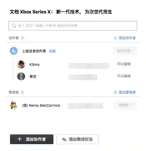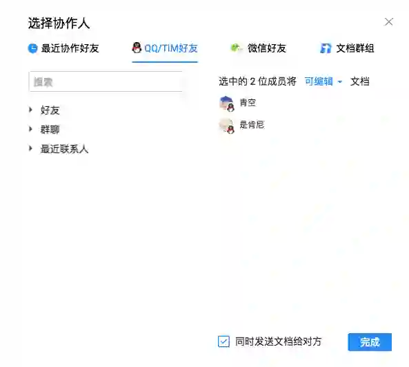 你可以直接添加若干个 QQ 好友或 QQ 群作为协作者,抑或是通过小程序邀请微信好友进行编辑;但有些奇怪的是,批量选中的 QQ 好友,只能一次性授予同样的权限。