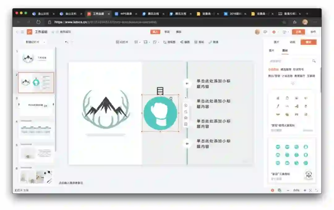 由于对接了「稻壳儿」的资源,用户可以直接在幻灯片中插入这一服务提供的在线图片与图标,其中有很多设计得别具一格的图标,在幻灯片中适当放上一些,能为表现力加分不少。