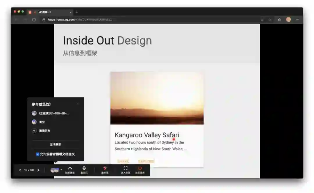相较石墨简单到简陋的远程演示功能,腾讯文档显然要强大不少;它支持幻灯片与文本文档的远程演示,可以将鼠标光标作为激光笔,同时还能开启语音交流;在权限控制上,放映者可以关闭观看者的麦克风,以及是否允许他们翻看全部内容。