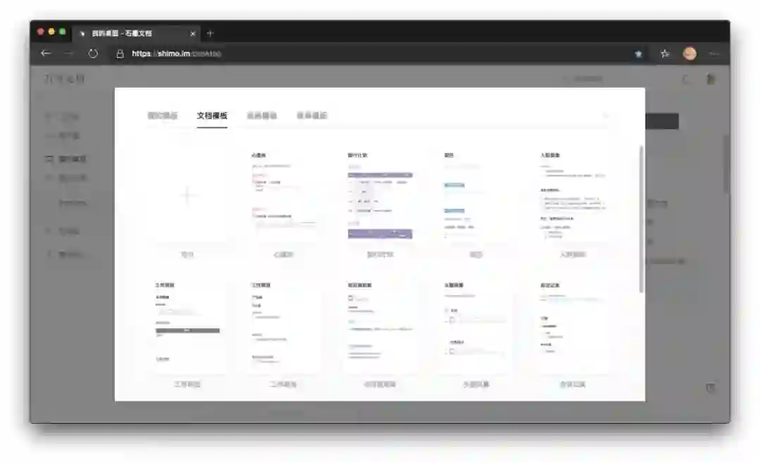 三家文档都提供了各种不同的模版,但其中石墨的使用逻辑不太一样,如果在下拉菜单中选择文档类型,它会直接为你创建一个空白的文档;你需要手动选择「从模版新建」,然后才能选择需要的模版。