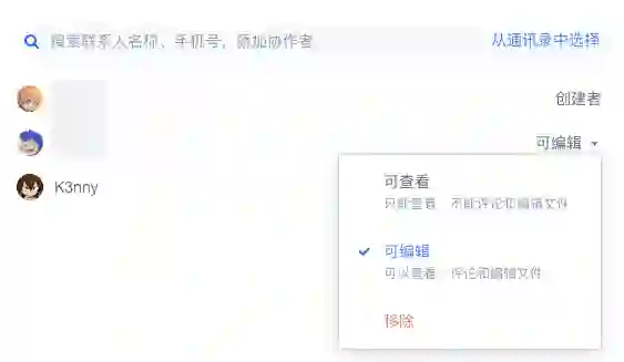 对于协作者,你可以设置「只能阅读」、「只能评论」和「可以编辑」三种权限,不过前两种在办理企业版后才能选择。