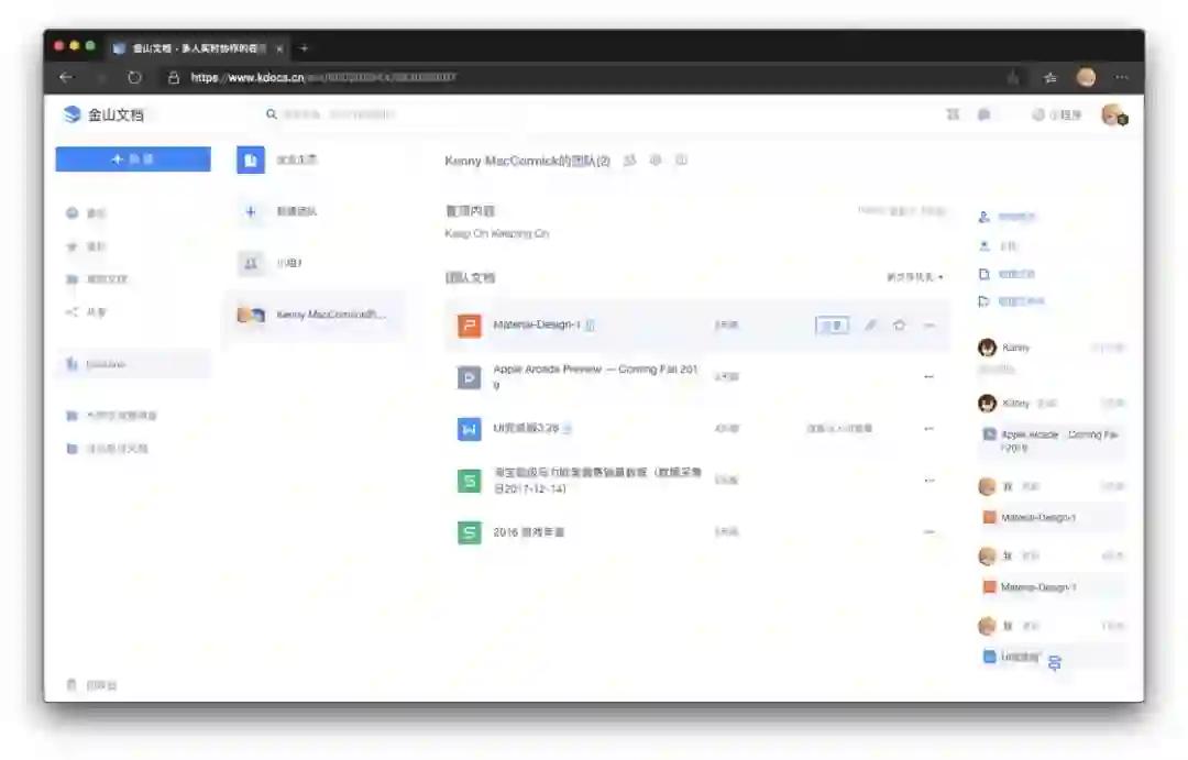 另一个金山做得不错的地方,意外地是在界面设计上:首先所有权限操作都可以直接在文件夹界面内完成,其次右下角还会显示成员的历史操作记录,布局与功能入口都清晰且合理,是三家中我个人认为最赞的。