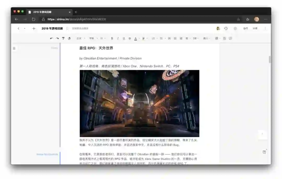 石墨的编辑器界面非常简洁,布局与各种网站和公众号的发布后台非常相似。除了位于中心的文字编辑区和左侧的目录,几乎所有的主要功能,都被浓缩在上方的工具栏中;而且在默认状态下,新建的文档还会自动提供标题区域。