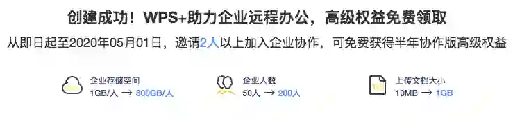创建企业之后,在 2020 年 5 月 1 日之前,只要再拉两个人加入企业,就可以获得半年的协作版服务。其中最大的升级在于,企业中的所有人都可以享受 800GB 的云盘容量。