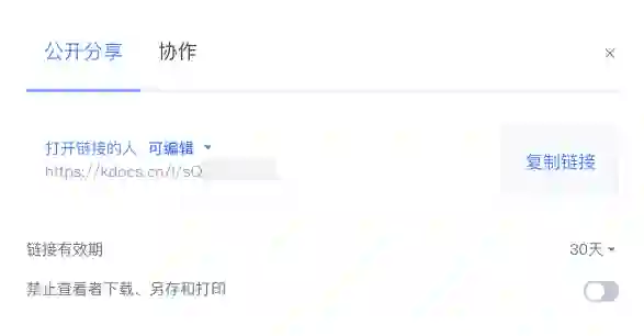 腾讯和金山都在编辑许可的基础上增加了一些权限设置,例如链接的有效期,以及是否禁止查看者下载、另存为或打印该文件。其中金山可以设置 7 天 / 30 天 / 永久的有效期,而腾讯则是 1 天 / 7 天 / 永久。