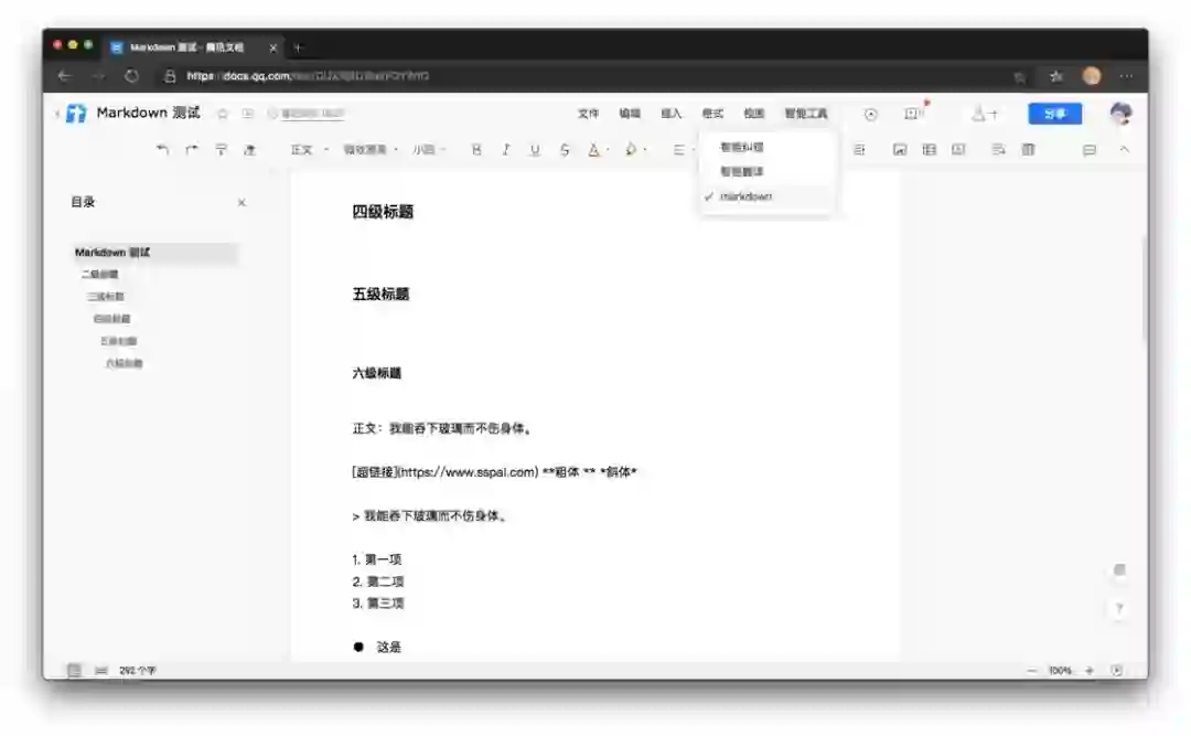 腾讯文档号称支持 Markdown,在「智能工具」中可以打开这个选项。然而根据实测,Markdown 支持仅仅覆盖到了标题和列表,甚至连粗体、斜体这样的基本语法都不包括在内,而且也不支持 .md 格式的文档导入。