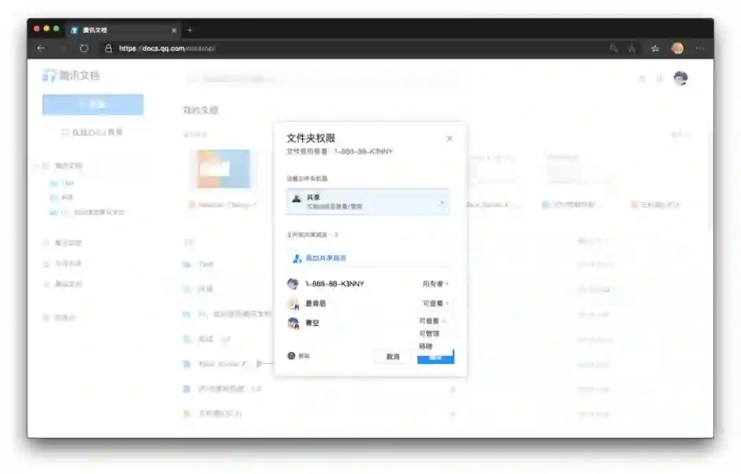 相比之下,腾讯在团队协作这一块提供的功能就显得有点少了。它没有类似于「团队」或者「企业」这种空间功能,只提供「共享文件夹」这一种特性,目录中的文件可以分别设置权限,但必须要打开文件后,在上方的协作菜单进行修改,批量操作起来要麻烦很多。