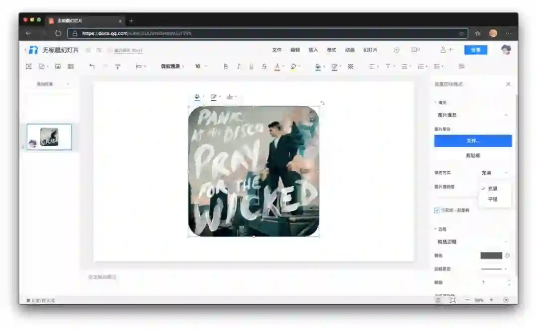 令我没想到的是,在具体的制作功能上,腾讯竟然有着略胜金山的地方;它可以插入表格(但不支持图表),同时对于形状等元素的格式设定也更加丰富,像是支持使用图片填充等。