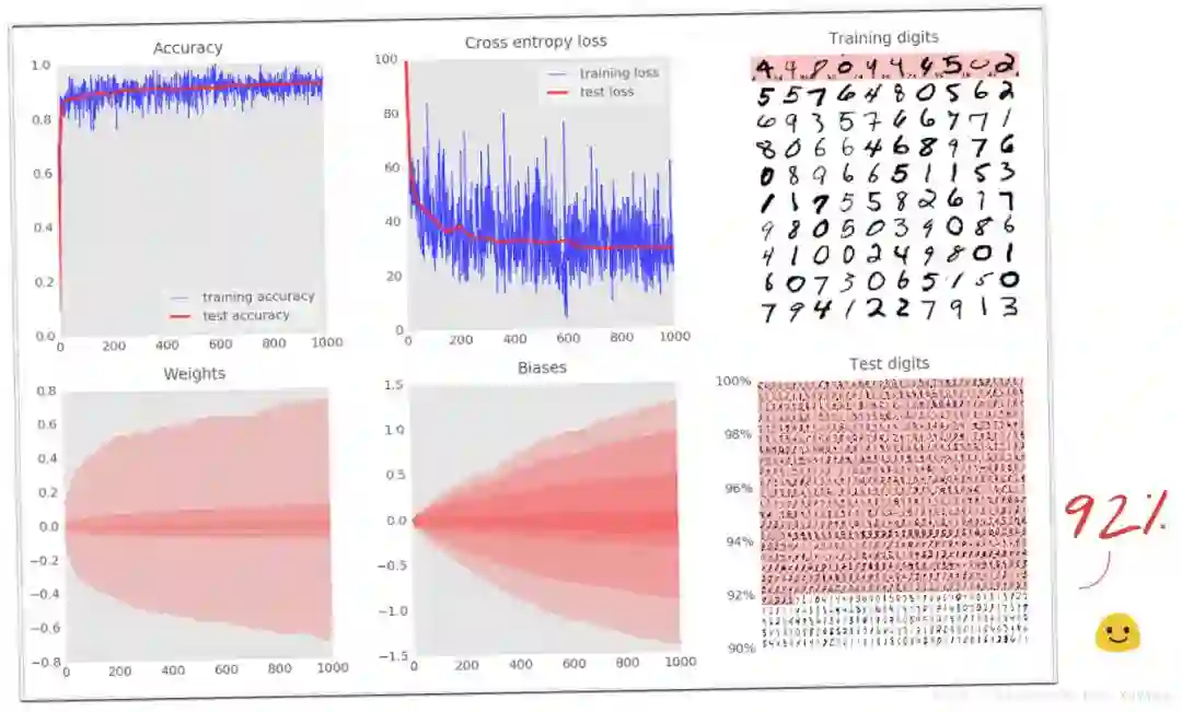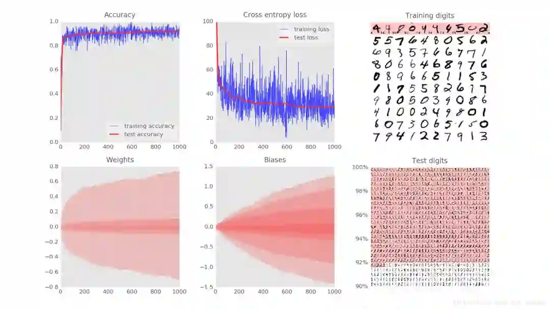 为TensorFlow构建的可视化工具是TensorBoard。其功能比我们本次教程中所需要的更多。它可以在远程服务器上跟踪您的分布式TensorFlow作业。对于我们在这个实验中我们只需要matplotlib的结果,能看到训练过程的实时动画,就当是个附带的奖励吧。但是,如果您需要使用TensorFlow进行跟踪工作,请确保查看TensorBoard。