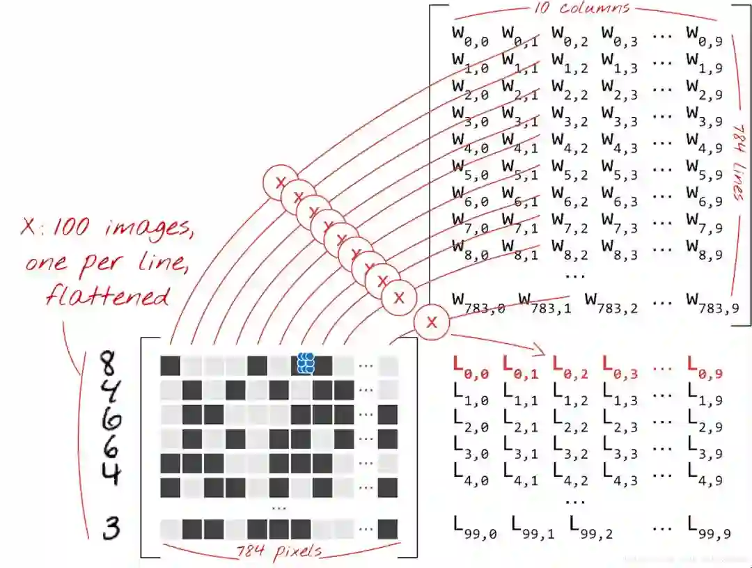 使用加权矩阵W中的第一列加权,我们计算第一张图像的所有像素的加权和。这个和值对应于第一个神经元。使用第二列权重,我们对第二个神经元做同样的事情,直到第10个神经元。然后,我们可以重复对剩余99张图像的操作。如果我们称X为包含我们100个图像的矩阵,则在100个图像上计算的我们10个神经元的所有加权和仅仅是XW(矩阵乘法)。