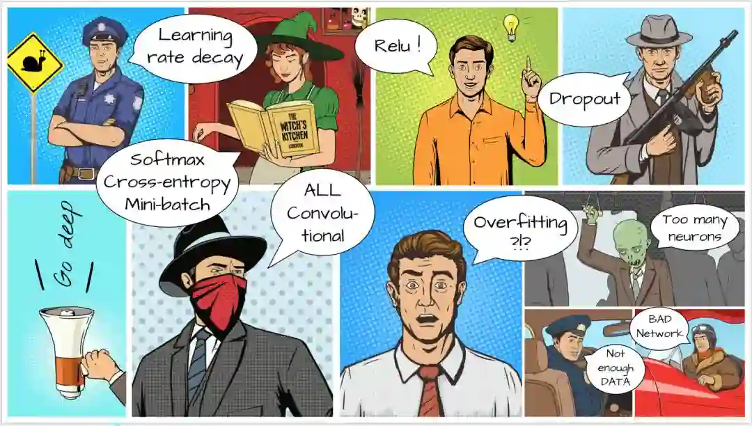 您已经建立了您的第一个神经网络,并一直训练到99%的准确性。沿途学到的技术并不特定于MNIST数据集,实际上它们在使用神经网络时被广泛使用。作为一个分手的礼物,这里是实验室的“悬崖笔记”卡,卡通版本。你可以用它回忆起你学到的东西: