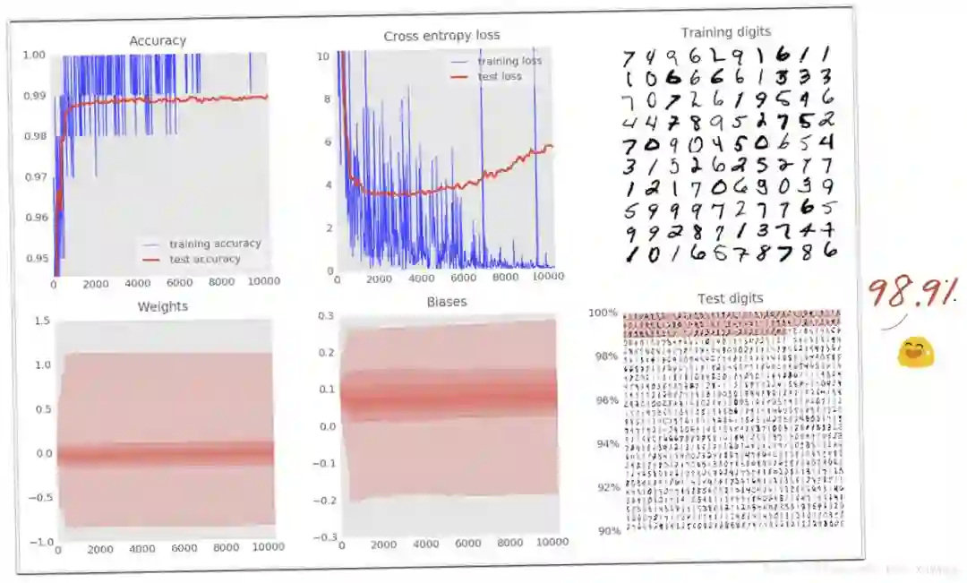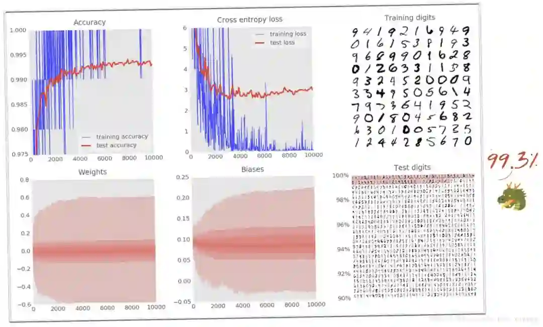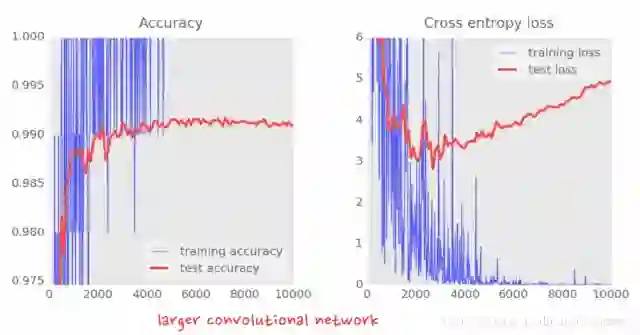 要完成,这是对我们更大的卷积网络的差异。给神经网络增加自由度,将最终准确度从98.9%提高到99.1%。增加dropout不仅驯服了测试损失,而且使我们能够安全地航行99%以上,甚至达到99.3%