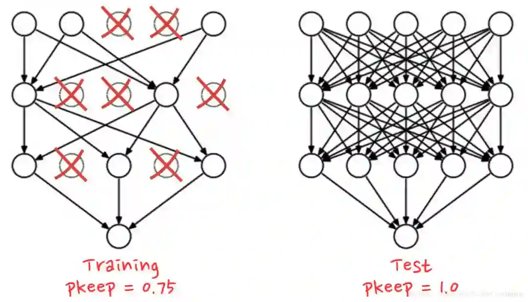 在丢失数据期间,在每次训练迭代中,您从网络中丢弃随机神经元。您选择pkeep保留神经元的概率,通常在50%至75%之间,然后在训练循环的每次迭代中,随机移除所有权重和偏差的神经元。不同的神经元将在每次迭代中被丢弃(并且您还需要按比例提升剩余神经元的输出,以确保下一层的激活不会移动)。当您测试网络的性能时,您将所有神经元都放回(pkeep=1)。