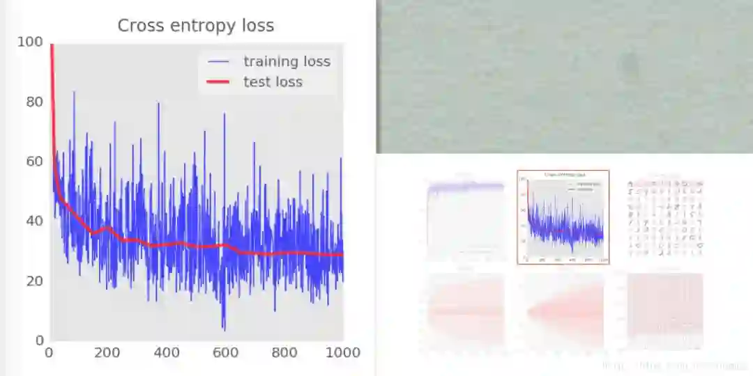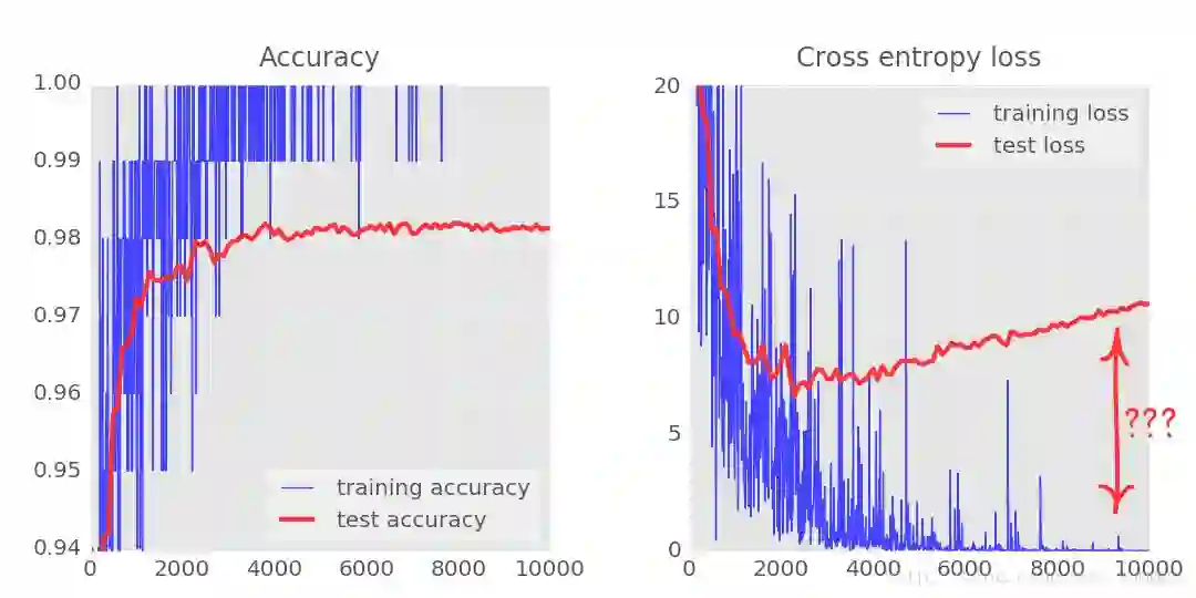 您将注意到,测试和训练数据的交叉熵曲线在数千次迭代后开始断开连接。学习算法仅用于训练数据,并相应地优化训练交叉熵。它从来没有看到测试数据,所以毫不奇怪,一段时间后,它的工作不再对测试交叉熵产生影响,测试交叉熵停止下降,有时甚至反弹。