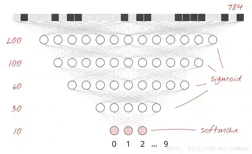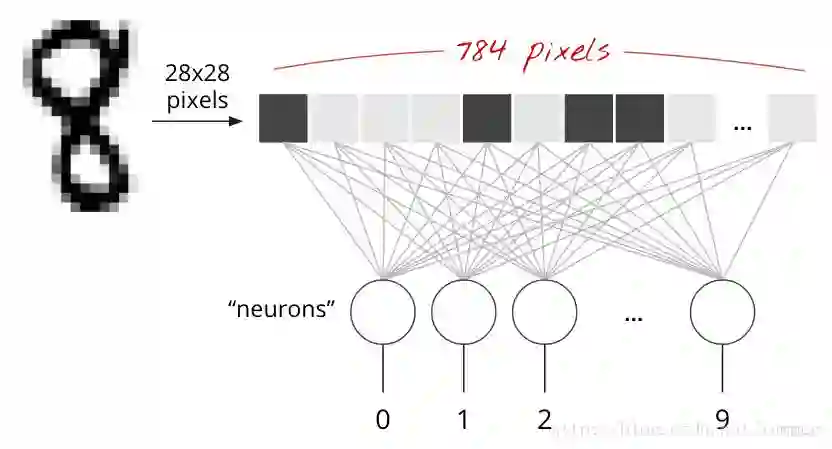 MNIST数据集中的手写数字是28x28像素的灰度图像。对于它们进行分类的最简单方法是使用28x28 = 784像素作为第1层神经网络的输入。