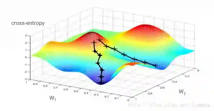 在该图中,交叉熵表示为2个权重的函数。实际上还有更多的。梯度下降算法遵循最快速下降到局部最小值的路径。训练图像也会在每次迭代中更改,以便我们收敛到适用于所有图像的局部最小值。
