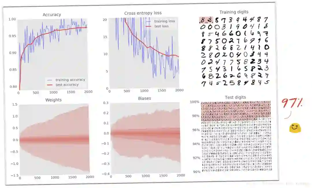 为了开展训练,我们将定义一个损失函数,即代表系统识别数字的程度值,并尝试将其最小化。损失函数的选择(这里是“交叉熵(cross-entropy)”)将在后面解释。您在这里看到的是,随着训练的进展,训练和测试数据的损失都会下降:这是好的。这意味着神经网络正在学习。X轴表示通过学习循环的迭代次数。