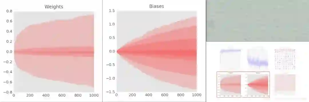 最后两个图代表了内部变量采用的所有值的范围,即随着训练的进行,权重和偏差。在这里,您可以看到,偏差最初从0开始,最终获得的值大致均匀分布在-1.5和1.5之间。如果系统不能很好地收敛,这些图可能很有用。如果你看到权重和偏差扩展到100或1000,训练可能就有问题了。