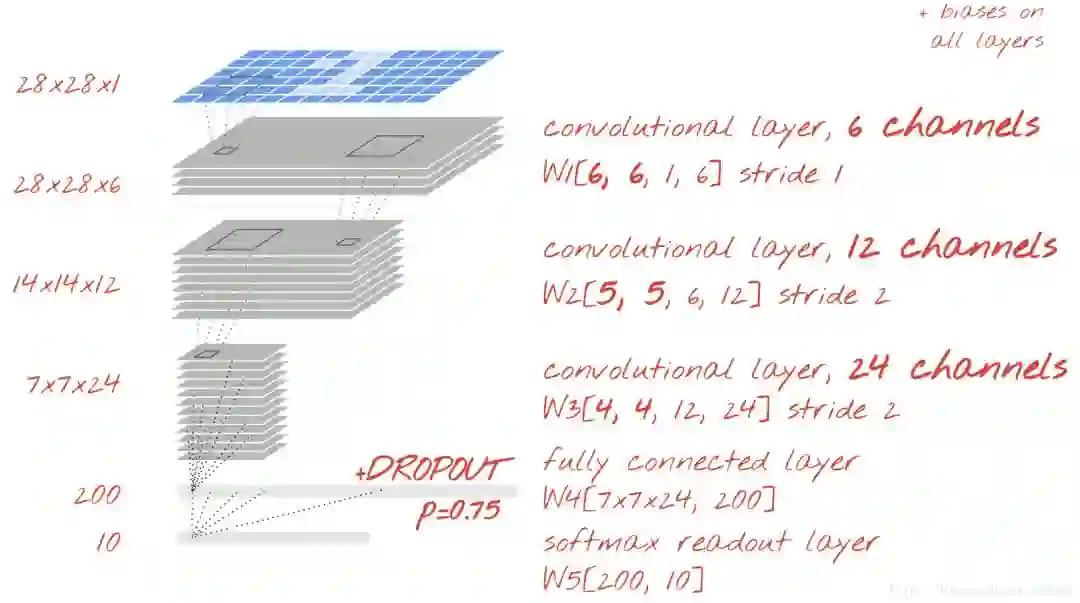 让我们建立一个手写数字识别的卷积网络。我们将在顶部使用三个卷积层,我们的传统softmax读出层在底部,并连接到一个完全连接的层: