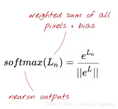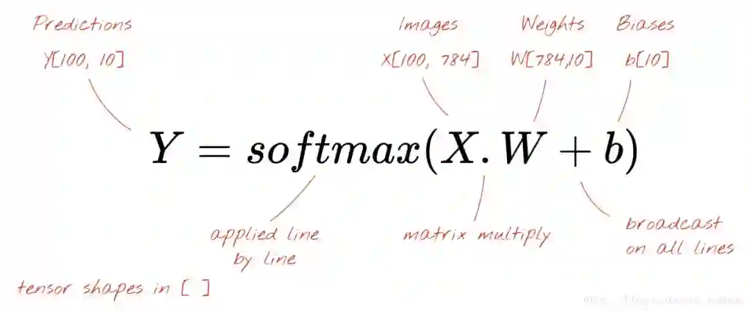 我们最后应用softmax激活函数,得到描述1层神经网络的公式,应用于100幅图像: