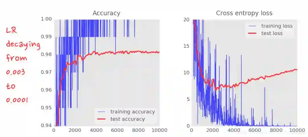 这些曲线真的很嘈杂,看看测试的准确性:它全部上下跳跃。这意味着即使学习率为0.003,我们也走得太快了。但是,我们不能将学习率除以十,否则训练将永远存在。良好的解决方案是开始快速,并将学习速率以指数方式衰减为0.0001。