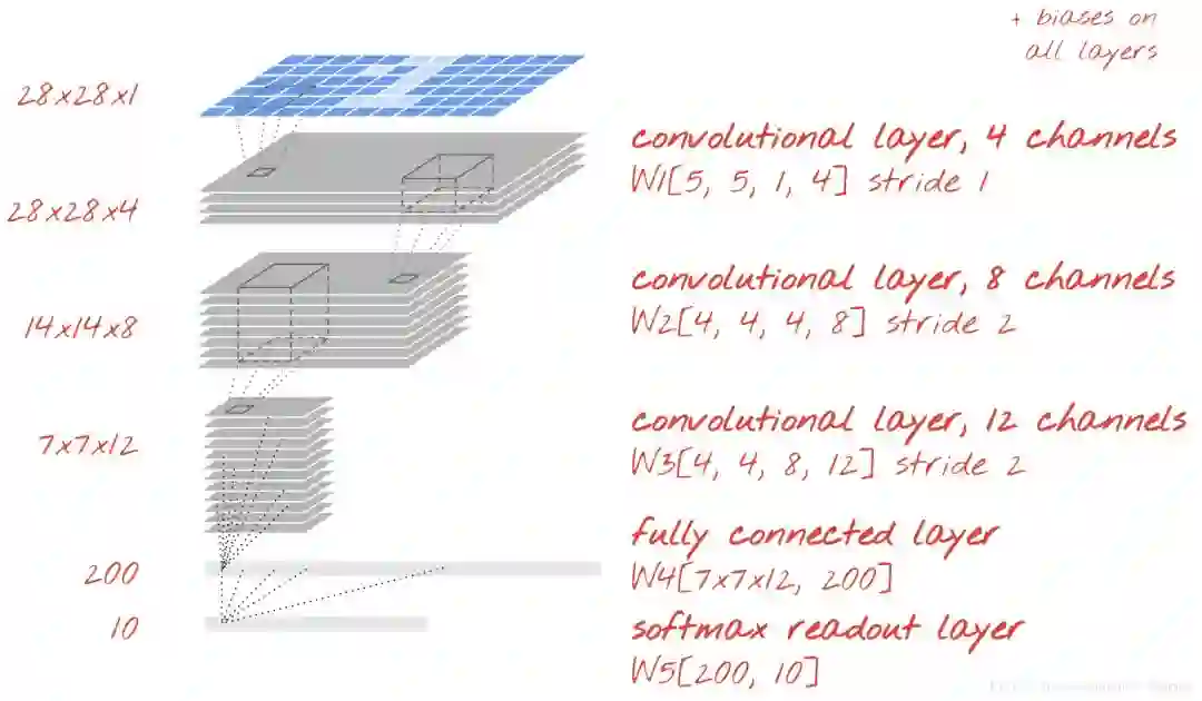 请注意,第二和第三卷积层有两个步长,这说明为什么它们将输出值从28x28降低到14x14,然后是7x7。完成这些层的大小,使得神经元的数量在每一层大致下降2倍:28x28x4≈3000→14x14x8≈1500→7x7x12≈500→200.跳转到下一节执行。